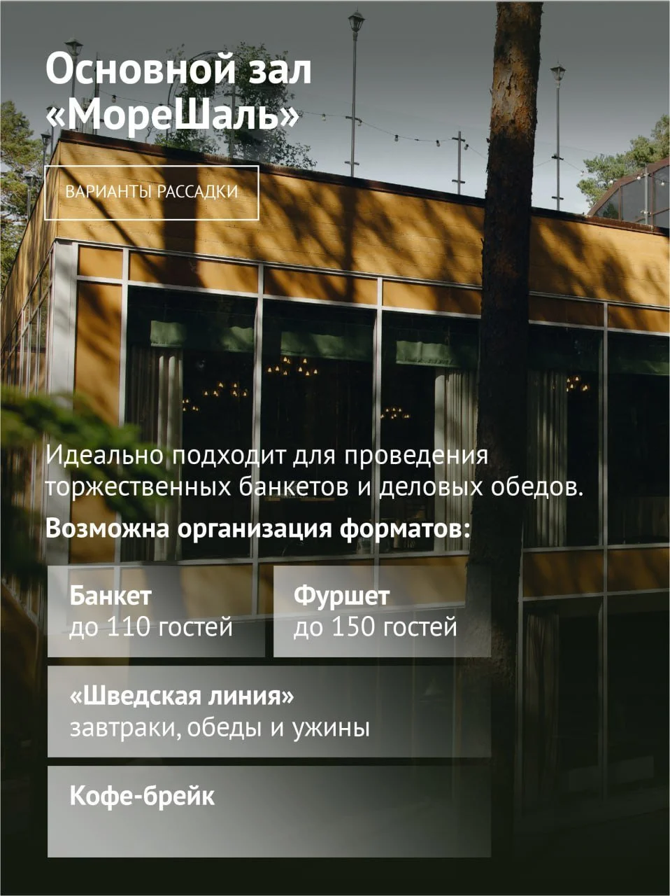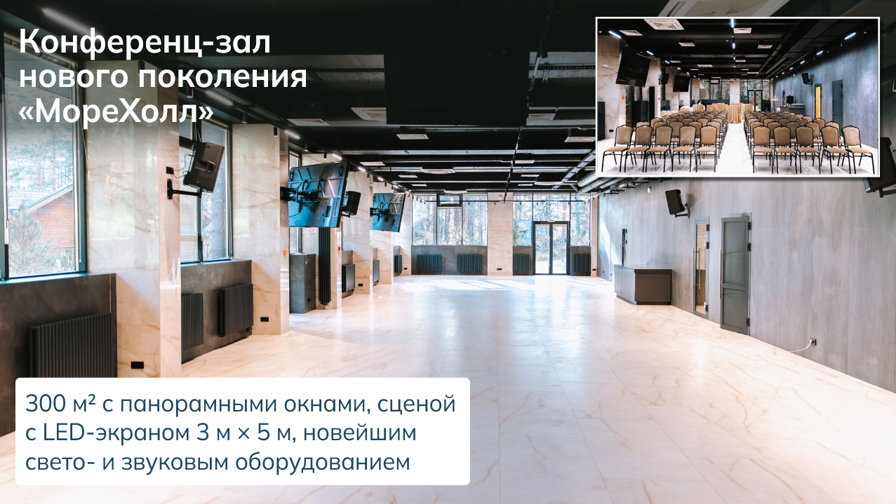 Эксклюзивный проект, созданный удивлять. “МореХол“ - это пространство: 300 м² с огромными окнами на сосновый лес, сценой, свето- и звуковым оборудованием.