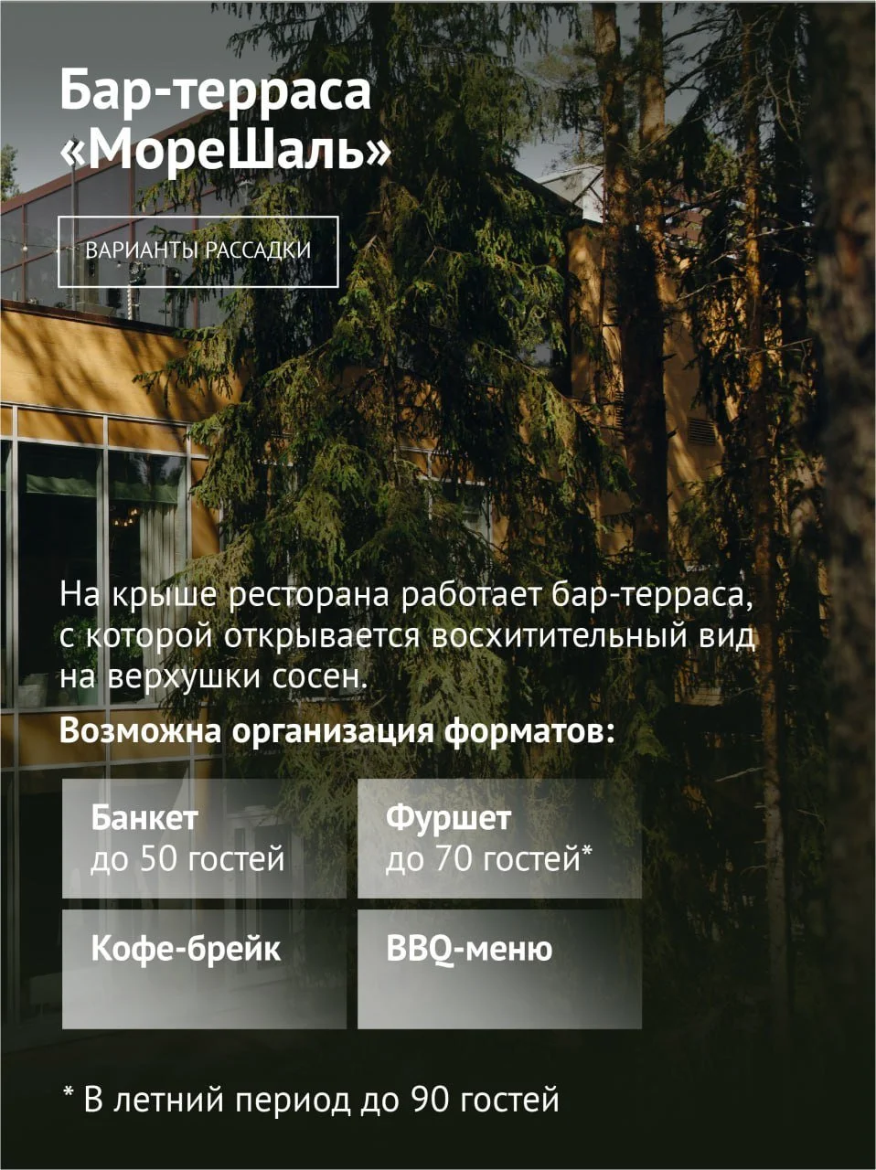 Ваше мероприятин пройдет в окружении сосен. Выделенная парковка и возможность зонировать пространство для любого формата мероприятия.